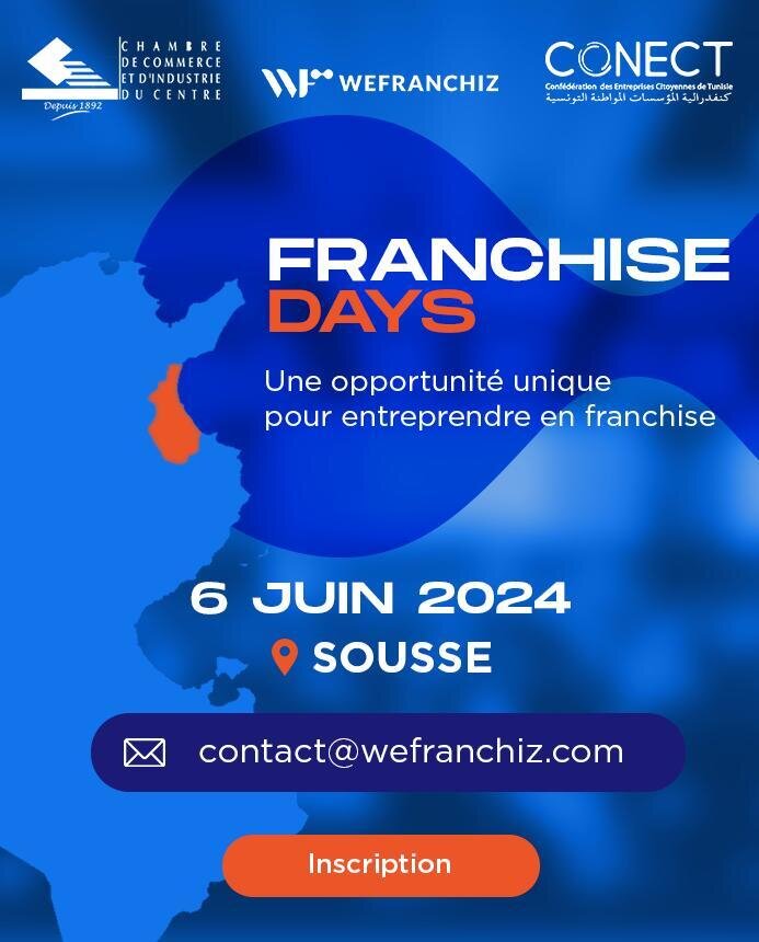 تحتضن جوهرة الساحل سوسة يوم 6 جوان 2024، ايام الامتياز التجاري، وهو حدث مخصص للنهوض بالامتياز التجاري في المنطقة الوسطى لتونس ببادرة من "Wefranchiz"، وهي منصة لربط حقوق الامتياز، وذلك بالتعاون مع غرفة التجارة والصناعة للوسط والمكتب الجهوي "لكونكت" بسوسة.
